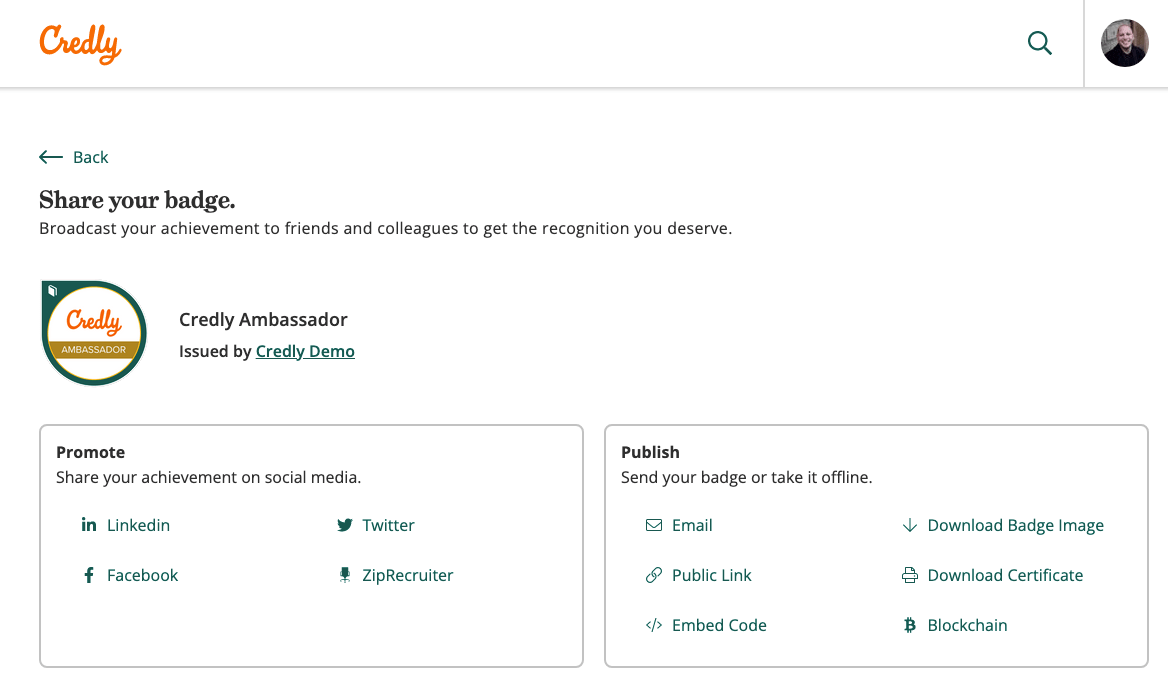 Credly Accept Badge - Representing your skills as a. At the top of the page, select the. Web log into your account on www.credly.com. What are the benefits of a badge? Add your badge to your linkedin profile and/or share to your feed through the share options within. Select the badge you'd like to share. Web after you create the account and log in, accept the badge! Credly is a global open badge platform that closes the gap between skills and opportunities. How can i be sure i receive my badge notification email? How do i get started?